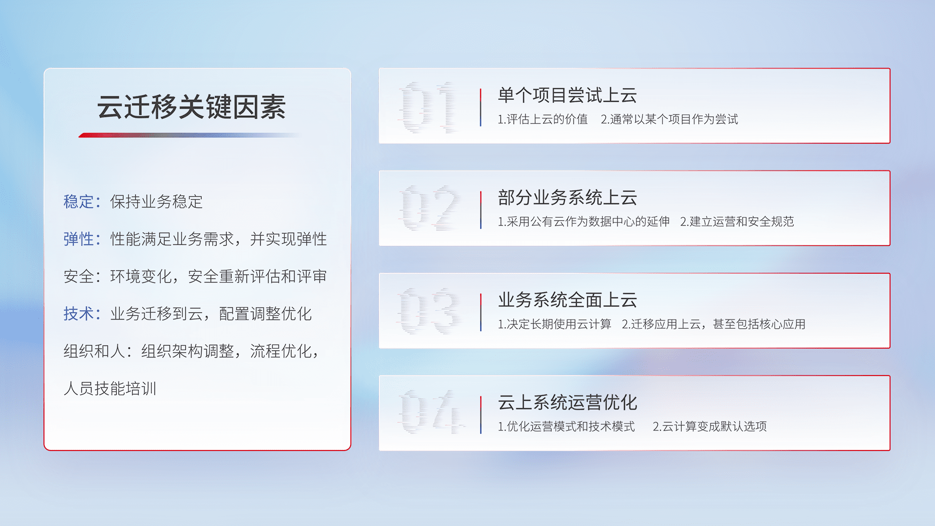 结合实际业务,,,从规划设计、、、、云平台选型、、云原生改造、、、数据迁移、、、集成交付,,迁移全过程为客户识别最佳上云路径,,做好风险识别管理,,,设计网络架构、、、、身份权限、、、、安全审计合规、、、、操作审计、、、、日志审计、、、监控告警策略、、、、多站点容灾设计等,,,对云上基础设施进行整体规划,,,,提升IT治理水平,,,,以满足弹性、、高可用、、、高性能的需求。。。