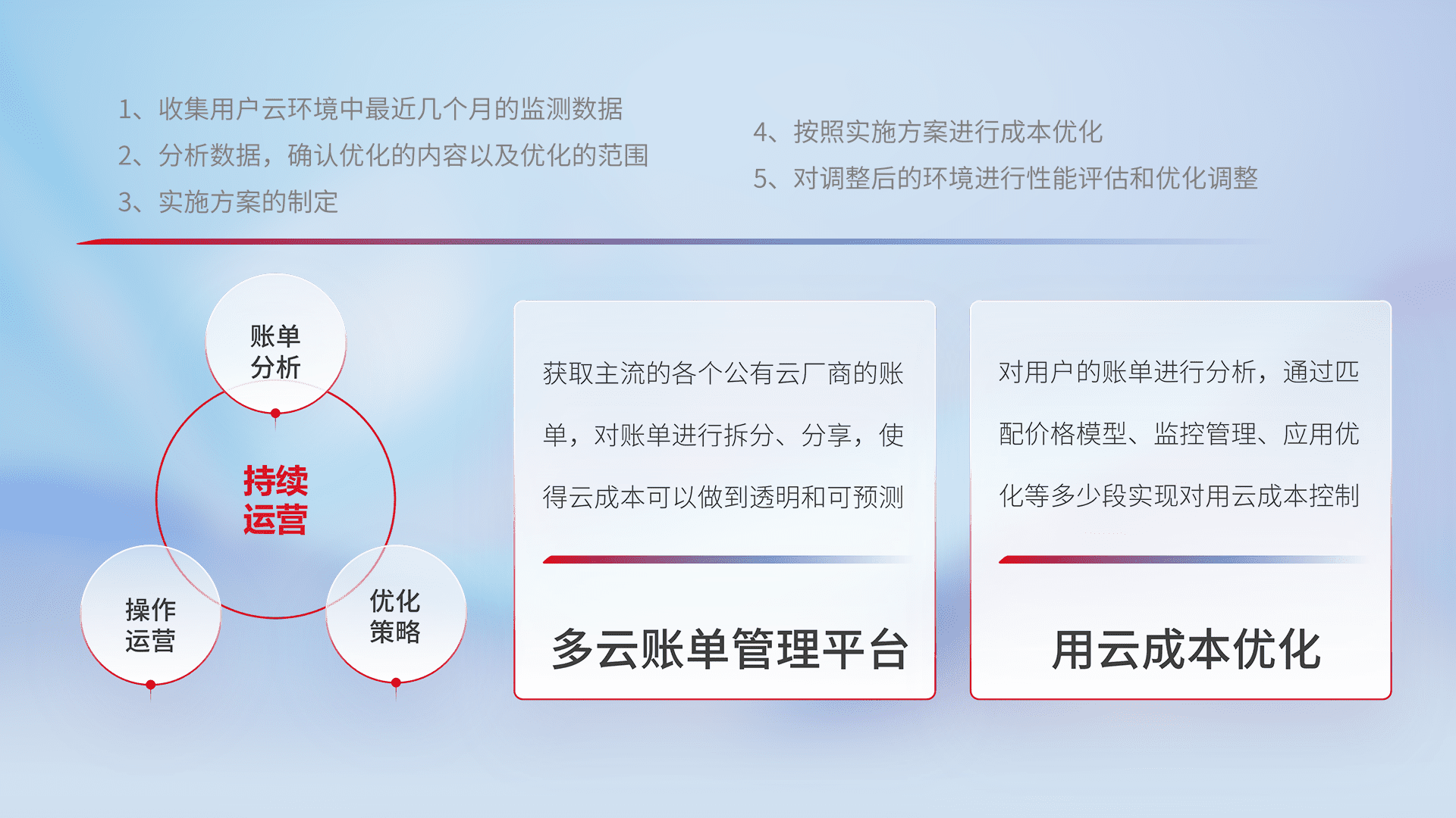 通过多云纳管,,,,以统一的资源数据模型把客户的云资源进行抽象和封装,,,进而实现对多云资源的统一操作,,保障云资源管理的可靠性、、稳定性与可用性。。。。量身定制化运维内容,,,,配置、、开发运维、、、补丁管理、、备份、、监控、、、认证和访问管理、、、审计和日常巡检等,,,,保障在用云过程中的可靠度,,稳定度以及高可用率。。
